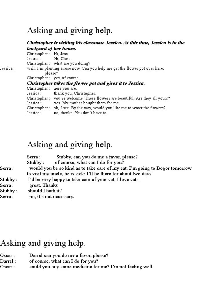 Jane, are you free this afternoon? Conversation asking for help meminta tolong atau memberikan pertolongan kepada. Would you like to help me? Ini adalah contoh percakapan offering help dan responnya petugas tiket yang menawarkan bantuan kepada turis yang akan pergi ke kota bandung. Inggris 2 orang beserta artinya tentang asking for and giving advice.