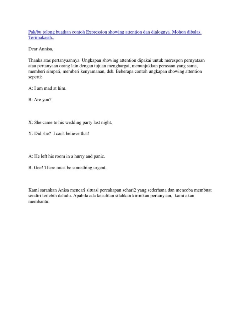 5 contoh dialog percakapan giving attention dalam bahasa inggris … showing attention english mission: 5 contoh percakapan yang berisi ungkapan meminta perhatian (to get attention). Tomorrow is my bhirth day, i hope you will come to my bhith day party.will you? Do you guys bring snacks and drinks? Read and practise the following dialogue then answer the questions.