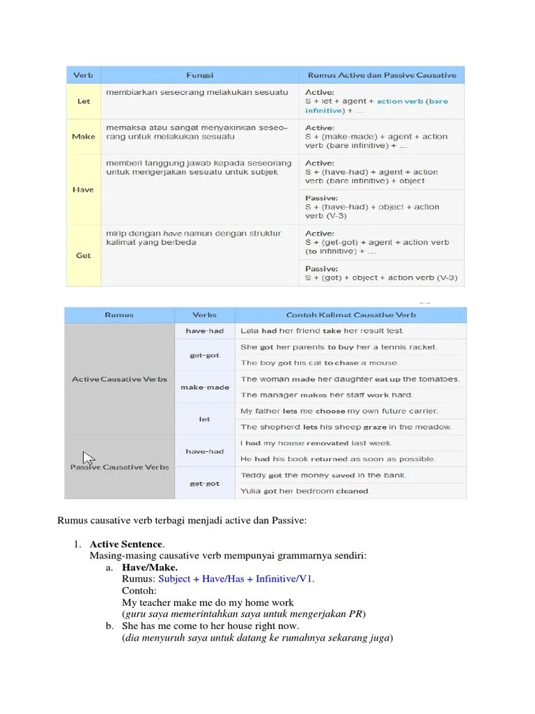 Kalimat causative verb terbagi menjadi 2 macam, yaitu active dan passive causative. The active causative · my father has me to sweep the rubbish (ayahku menyuruhku untuk menyapu sampah) · mrs. Subject + have + complement/object + [kata kerja pertama . Sedangkan noncausative verb, intinya sama dengan causative verb . Baiklah, pake contoh kalimat dalam bahasa inggris beserta terjemahannya saja ya agar lebih nempel di memori.