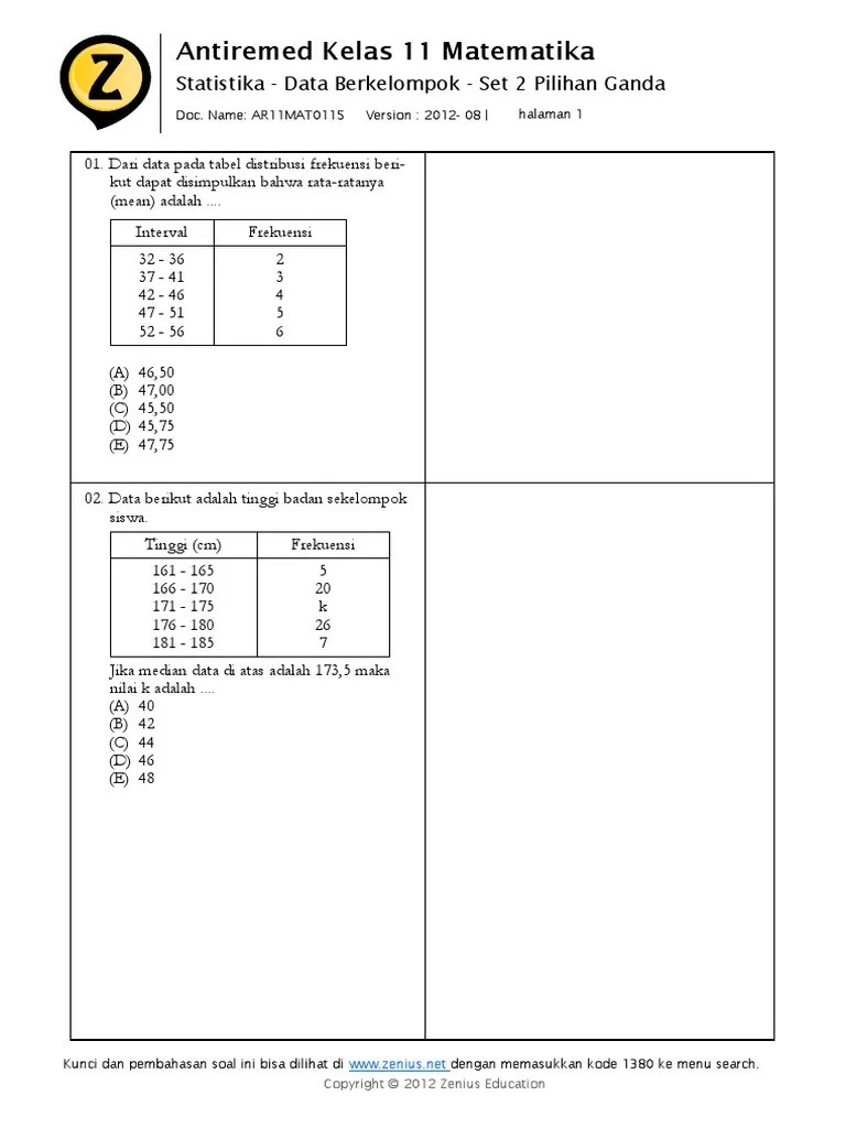 Simpangan antar kuartil untuk data tunggal dan kelompok: Jumlah soal ada 20 yaitu pilihan ganda. Tb = tepi bawah d1 = selisih frekuensi kelas modus dengan kelas sebelumnya Contoh soal statistika pilihan ganda dan jawaban beserta pembahasan. Rumus modus untuk data kelompok adalah: